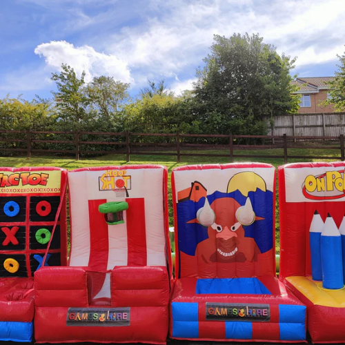 What an ample game set of this 4-in-1 inflatable carnival games from Channal for playing at carnivals and fairs. The set contains a basketball hoop shot game, two ring toss games (pencils and horns ) and one Tic-tac-toe.